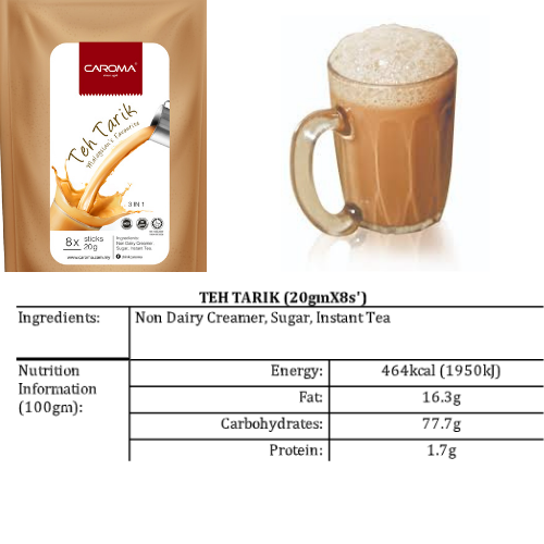 CAROMA ‘Teh Tarik’ is Malaysians’ all-time favorite “Pull” Milk Tea beverage and made from Premium selection of tea leaves. Its Creamy rich-tasting with silky smooth with Low-Glycemic index. Enjoy the real taste of CAROMA ‘Teh Tarik Malaysian’s Favorite in anytime and anywhere.